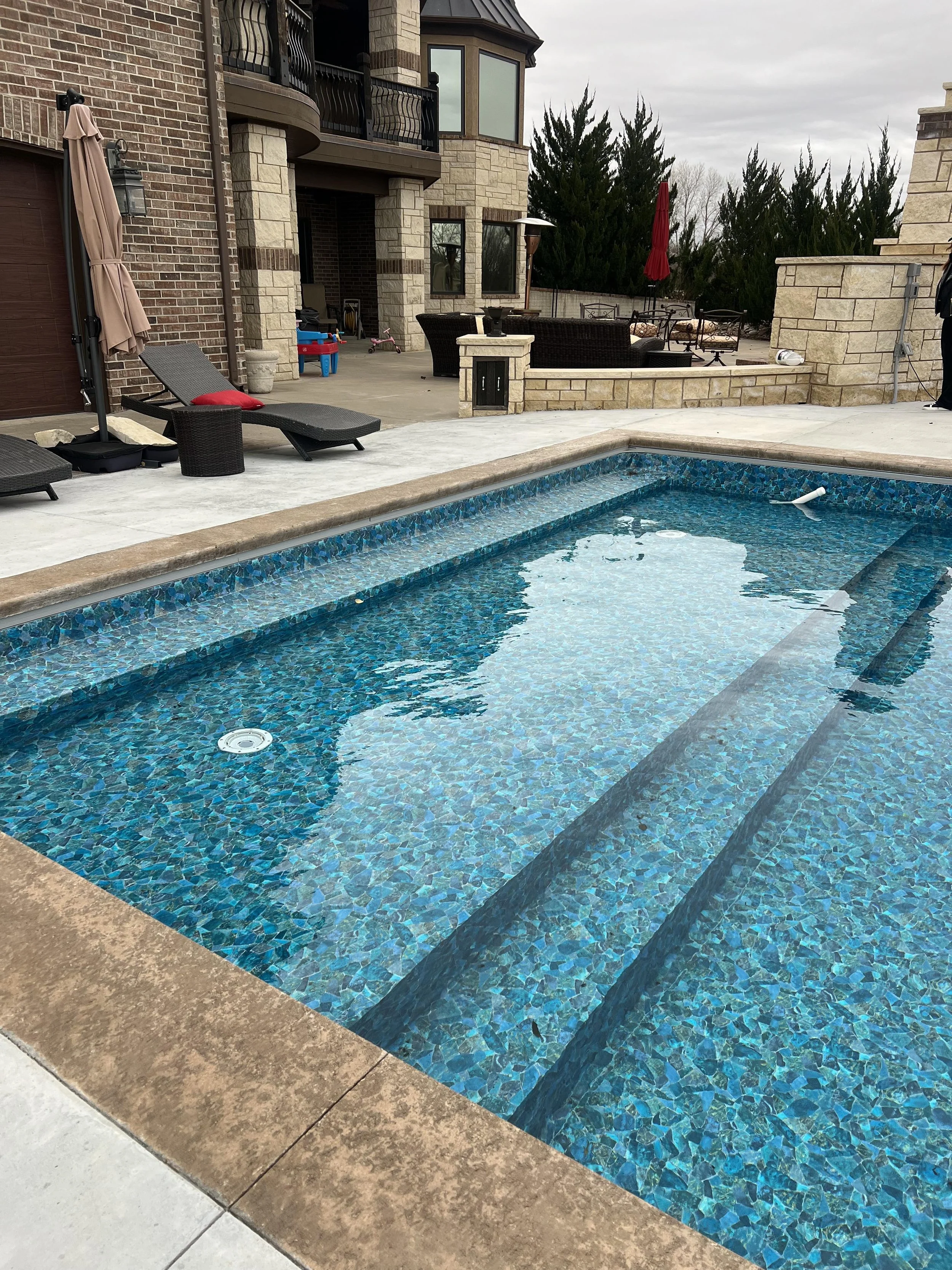 These steps not only provide a stylish entrance into your pool but also include a comfortable ledge where you can lounge, soak up the sun, or simply enjoy the view. This is our most popular option and families love it!