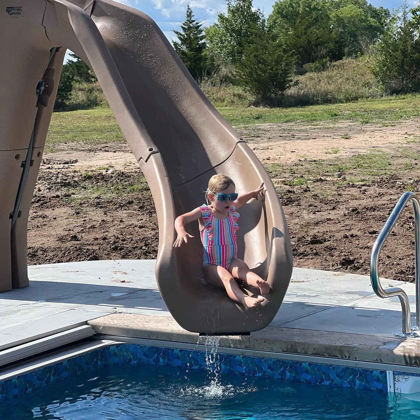 We have installed more slides than diving boards this year, and a big reason for this is that diving boards require a bigger and deeper pool—at least 8’ of depth—for it to pass safety regulations, whereas slides only need 6’ of depth. Our slides are plumbed and installed, and our customers—especially their kids—love them! A smaller pool does not have to mean less fun.